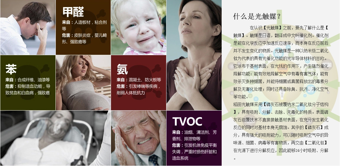 在認識【光觸媒】之前,要先了解什么是【觸媒】。觸媒是日語,翻譯成中文叫催化劑。催化劑是能在化學反應中加速反應速率,而本身在反應前后并不發(fā)生變化的物質(zhì)。光觸媒是一種以納米級二氧化鈦為代表的具有光催化功能的光半導體材料的總稱。它涂布于基材表面,在光線的作用下,產(chǎn)生強烈催化降解功能:能有效地降解空氣中有毒有害氣體;能有效殺滅多種細菌,并能將細菌或真菌釋放出的毒素分解及無害化處理;同時還具備除臭、抗污、凈化空氣等功能。 稻田光觸媒采用【磷灰石被覆納米二氧化鈦分子結(jié)構(gòu)】,具有吸附、分解、去除、無毒化的特質(zhì)。表面磷灰石包覆技術(shù)不直接接觸基材表面,在充分發(fā)生氧化反應的同時對基材本身無腐蝕。其中的【磷灰石】成分,具有強大的吸附能力,可以隨時吸附空氣中的異味源、細菌、病毒等有害物質(zhì),再交由【二氧化鈦】在光源下進行分解反應,因此能夠24小時吸附、分解